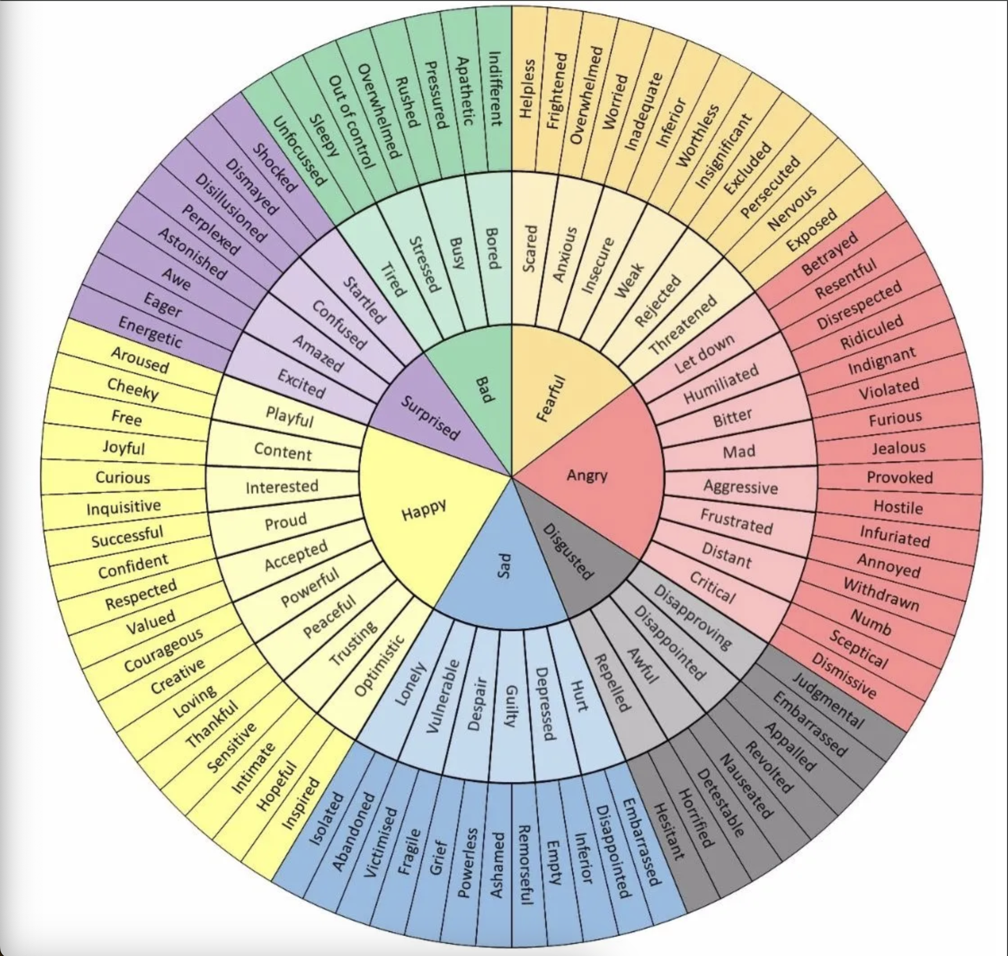 To do this, you will need a piece of paper, and a pen. Divide the sheet of paper in half, vertically, then using the “Wheel of Emotions” below, write down all the emotions you experience in an average week. Write the negative emotions on the left side of the paper, and the positive emotions on the right side.